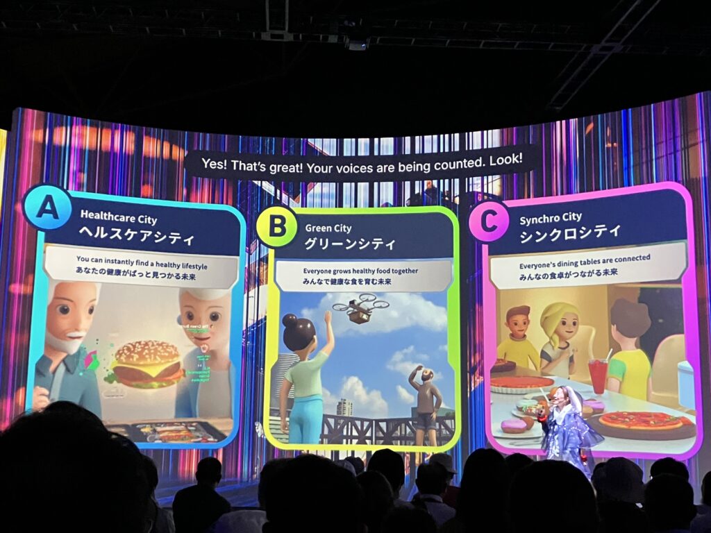 万博の各展示では、来場者が未来社会を具体的に思い描けるような仕掛けが随所に見られました。特に未来の都市パビリオンのシアターでは、投票システムを使って未来社会を創り出す体験ができます。このような体験は来場者にとって、未来社会をより具体的にイメージするきっかけとなるでしょう。